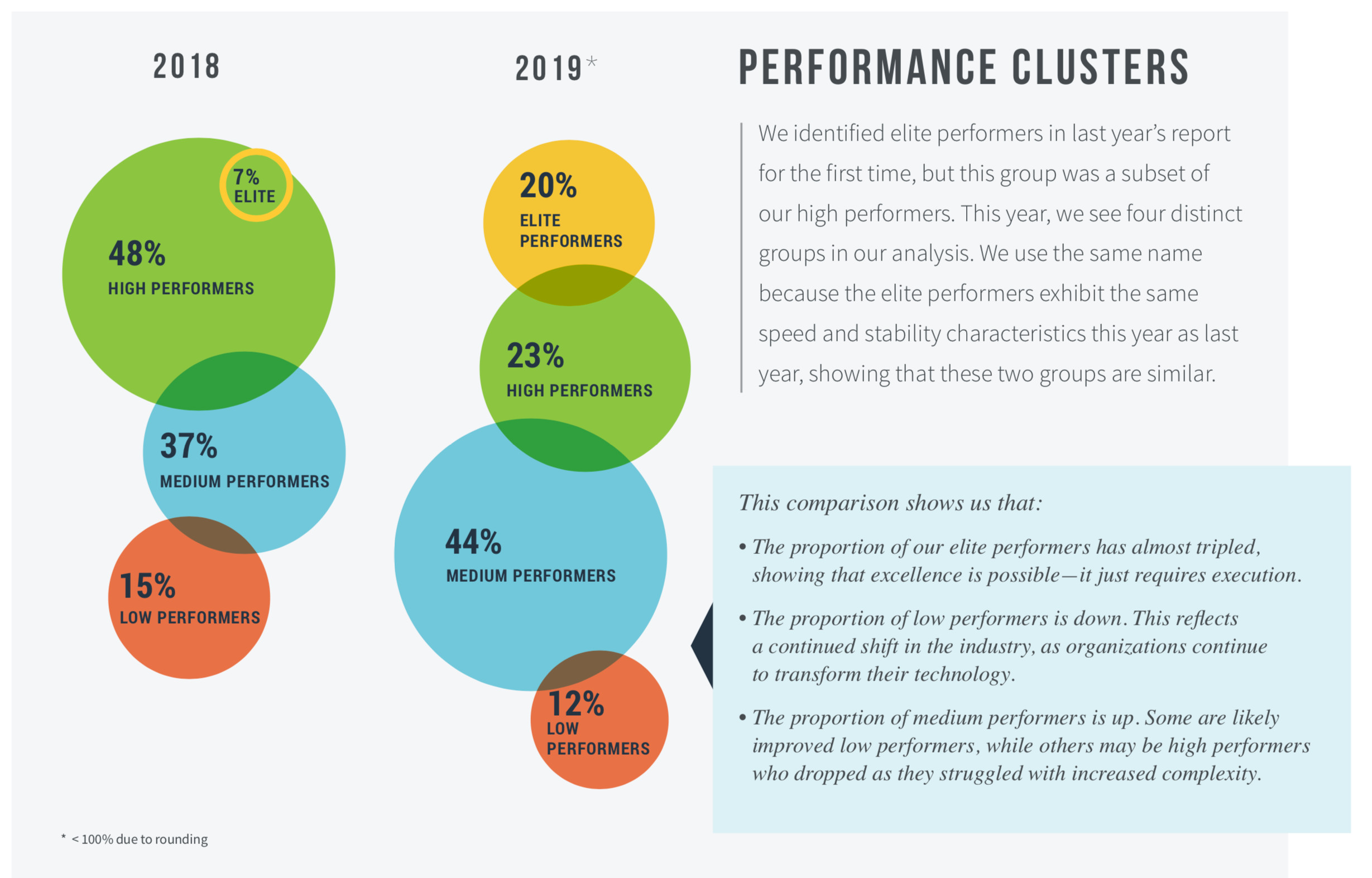 在這個(gè)泡泡圖中,我們可以看到有多少比例的受訪者處于精英、高效、中等和低效的陣營(yíng)。復(fù)述一下今年的一個(gè)重大發(fā)現(xiàn):精英表現(xiàn)者已經(jīng)從去年的高效能表現(xiàn)者集團(tuán)中脫穎而出,他們?cè)谥笜?biāo)的絕對(duì)值和總體數(shù)量上都增長(zhǎng)迅敏,增長(zhǎng)率高達(dá)將近3倍?!綝evOps教練點(diǎn)評(píng):回顧一下這份報(bào)告的標(biāo)題中加入的加速度的關(guān)鍵字,一旦某個(gè)組織的實(shí)施方法得當(dāng),一個(gè)持續(xù)優(yōu)化的組織的整體效能就可能做上火箭,加速度的飛離地球。而加速度不足的企業(yè)則處于持續(xù)跌回地面的窘境?!?/span>