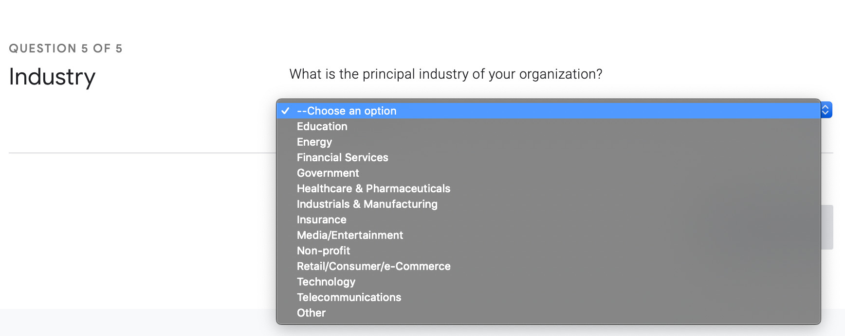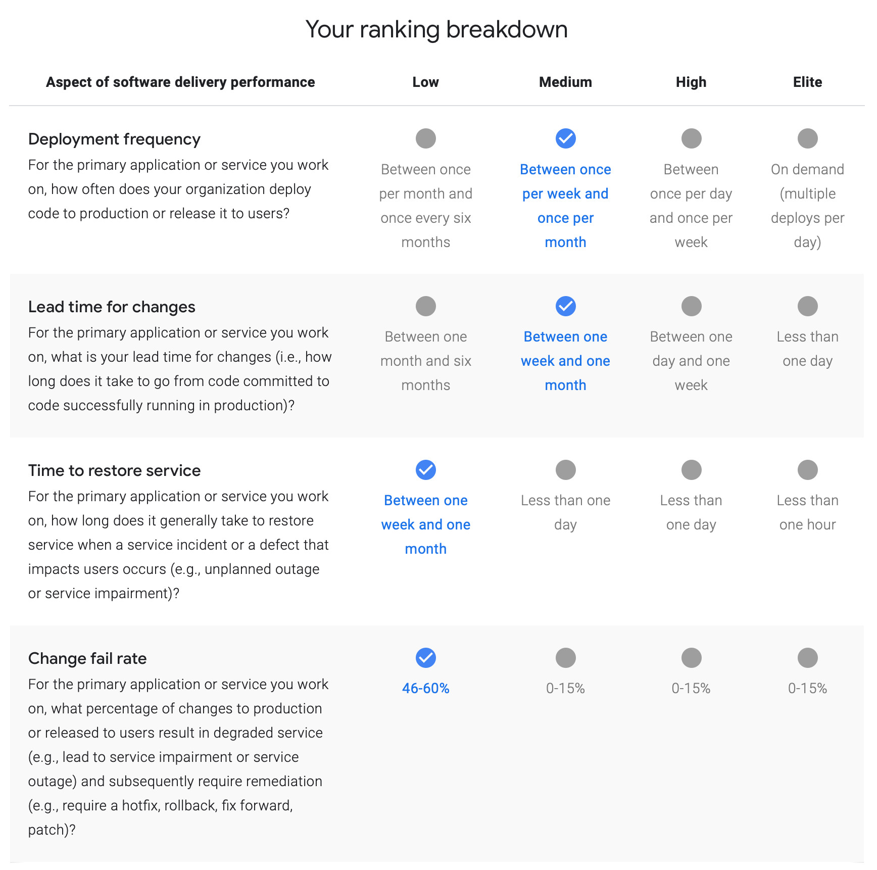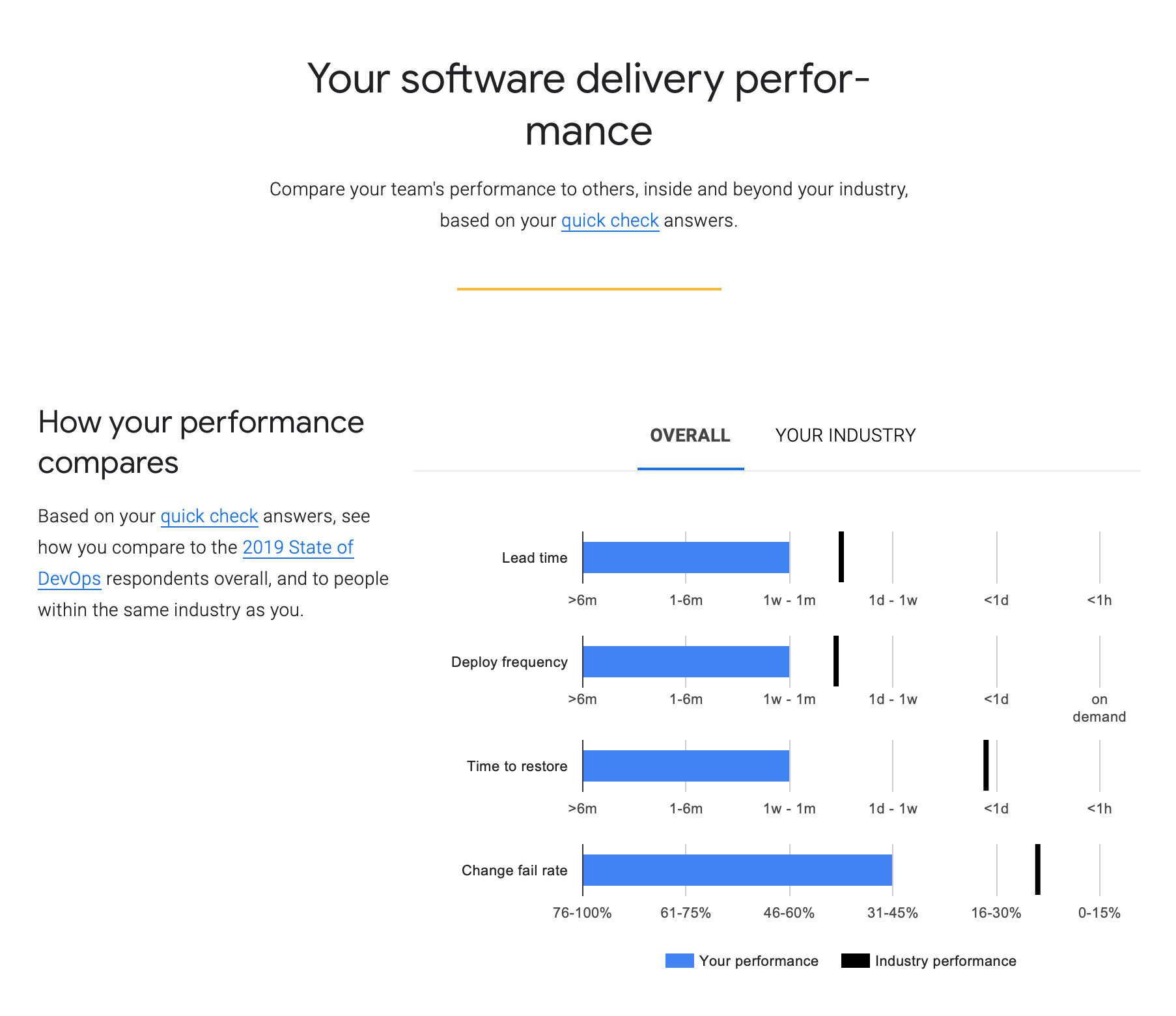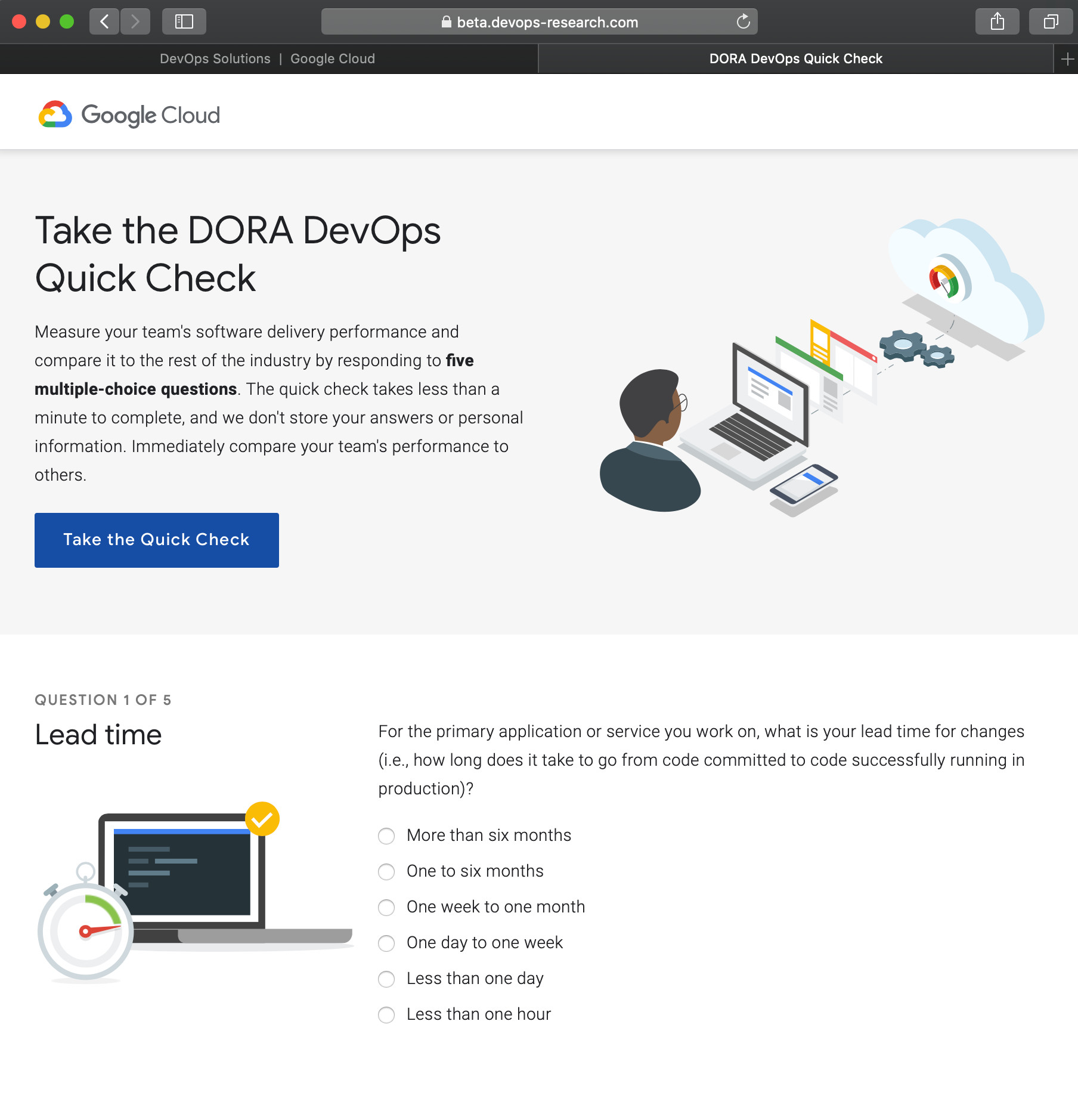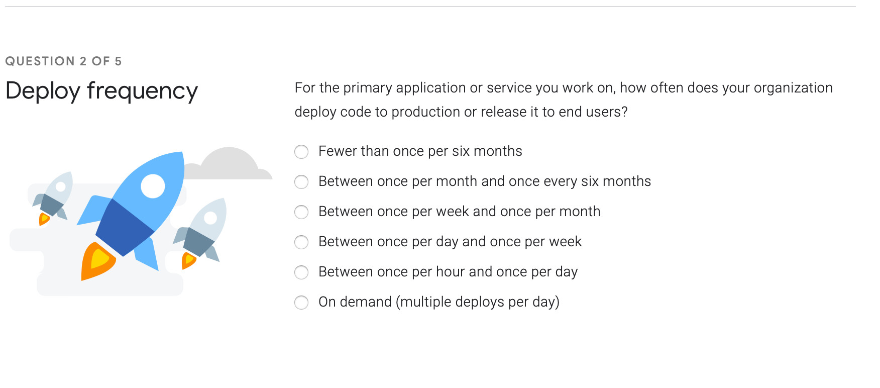 這可能是Google收編DORA團(tuán)隊(duì)所買到的最有價(jià)值的一部分資產(chǎn),歷年來(lái)的DevOps調(diào)查問(wèn)卷參與者的問(wèn)卷答案數(shù)據(jù)庫(kù)。Google今年將這個(gè)數(shù)據(jù)庫(kù)向公眾開(kāi)放了,網(wǎng)址在 https://beta.devops-research.com/performance.html (這個(gè)網(wǎng)址應(yīng)該不用科學(xué)上網(wǎng),會(huì)出現(xiàn)證書(shū)錯(cuò)誤提示,請(qǐng)忽略繼續(xù)訪問(wèn)該頁(yè)面)。在你回答了下面的五個(gè)問(wèn)題后,就可以獲得一份自己的行業(yè)基準(zhǔn)測(cè)試報(bào)告。