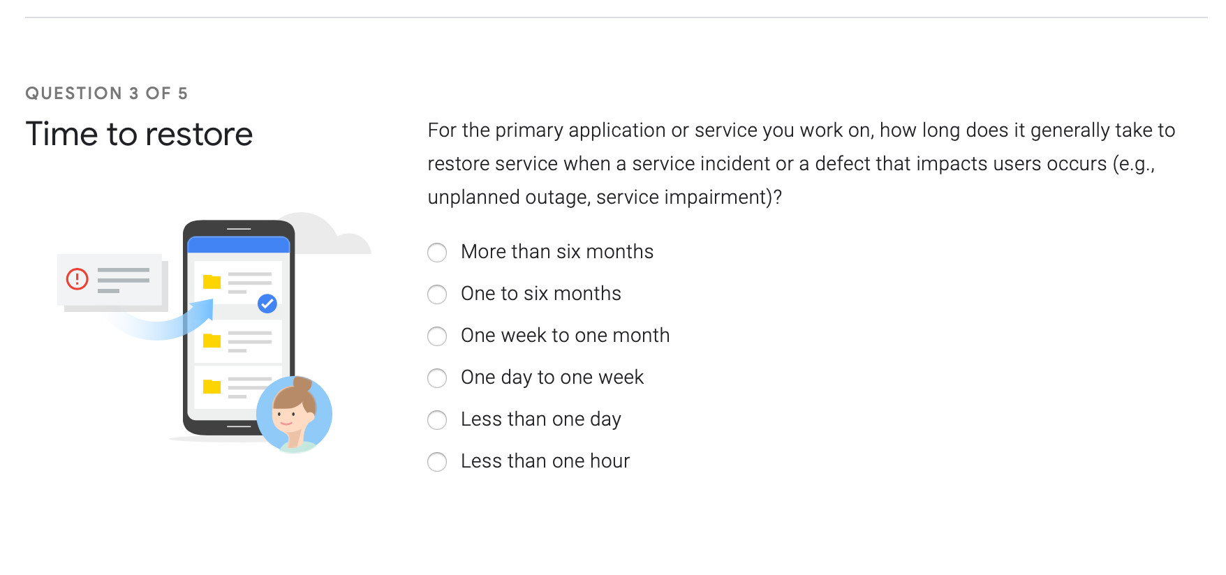 穩(wěn)定性–服務(wù)恢復(fù)時(shí)間: 對(duì)于您工作的主要應(yīng)用程序或服務(wù),當(dāng)服務(wù)中斷或出現(xiàn)影響用戶Bug時(shí)(如:計(jì)劃外中斷、服務(wù)受損),恢復(fù)服務(wù)通常需要的時(shí)間。調(diào)查這個(gè)指標(biāo)的問(wèn)題見(jiàn)2019年加速度DevOps狀態(tài)調(diào)查問(wèn)卷中的第二部分的第四題。